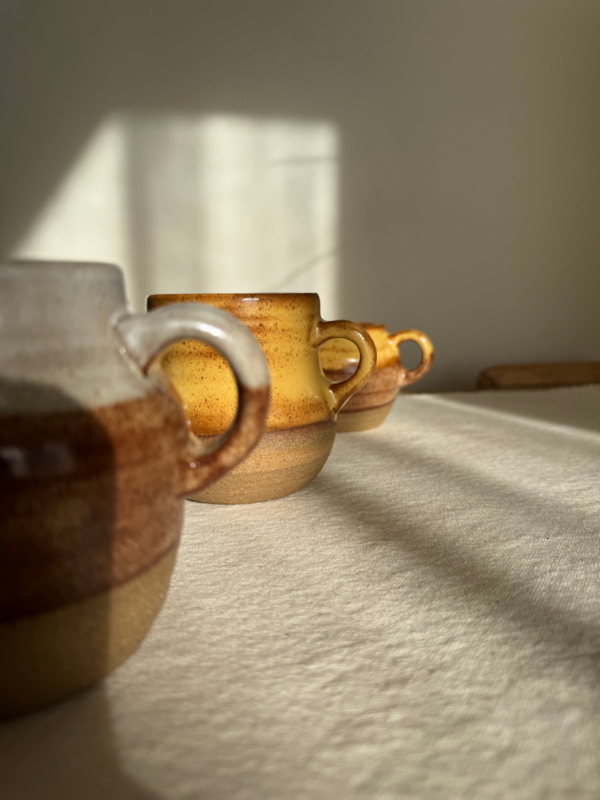 Toasty yellow mug with raw clay bottom.